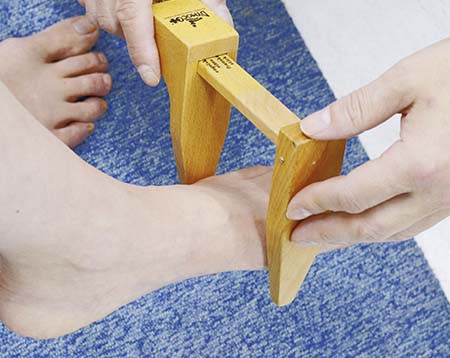 足の長さと幅、甲の高さと幅、また甲は体重をかけていない状態も計測。タコの有無や足趾の変形がないかを確認します。